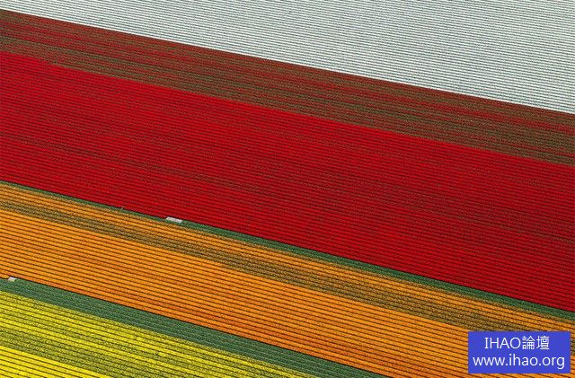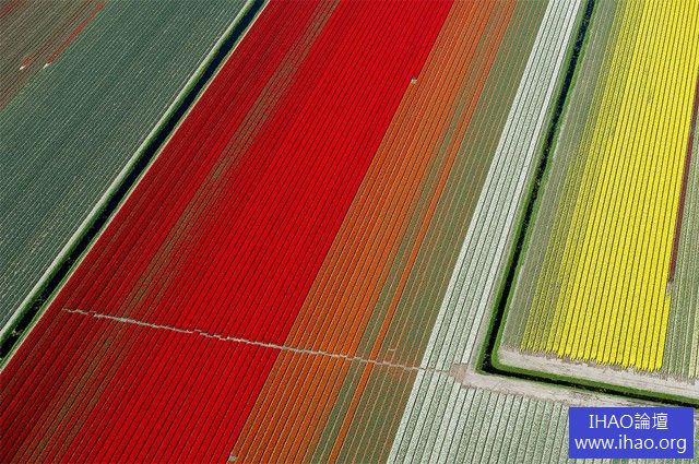 法國攝影師Normann Szkop從上空俯拍位於北荷蘭Anna Paulowan的鬱金香花田,各種顏色的花田整齊排列著,就好像是上帝拿著色筆,在地上畫出一道道彩虹,驚艷整片大地。