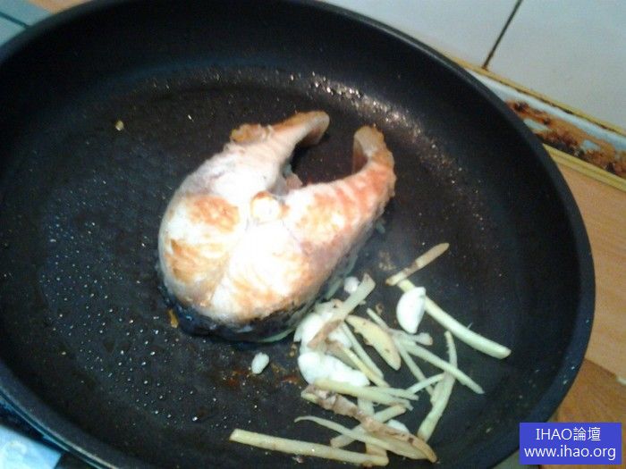 5鍋中放入草魚,煎至兩面變色變熟後放入薑絲和蒜頭下去爆香