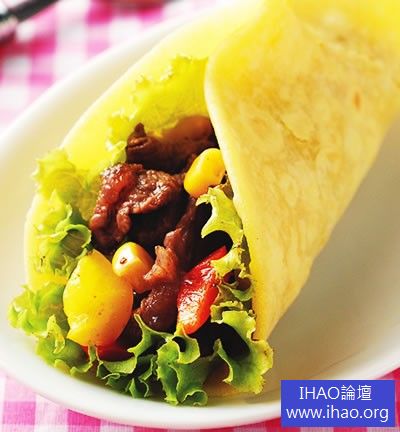 2.將玉米餅攤平,在中間放入適量作法2的內餡包捲起來即可。