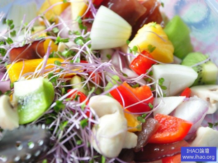鳳梨 1小塊 奇異果 1顆 白/紫洋蔥 1/2顆 紅/黃彩椒 1/3顆 黑木耳 1片 洋菇 3大顆 有機紅高麗菜苗 1小把 葵果特級甜辣醬 適量 黑白芝麻 適量