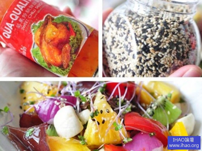 3取出泰式甜辣醬拌淋在食材上,灑些黑白混合芝麻就好囉
