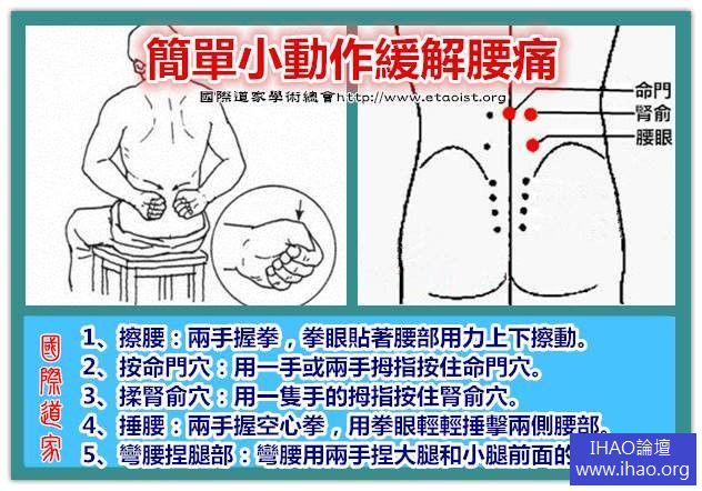 1、擦腰:兩手握拳,拳眼貼著腰部用力上下擦動。