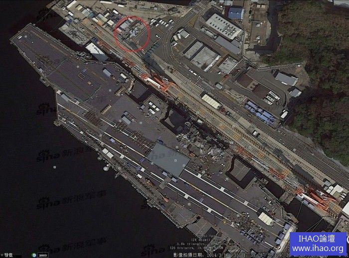 衛星拍攝圖片時,航空母艦正在碼頭上休整,可以看到甲板上堆放的各類物資。從碼頭上各式建築和通道能看出是個多麼複雜的工程。碼頭上紅圈處還有一架F/A-18大黃蜂戰鬥機。