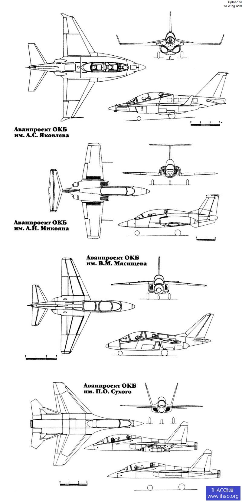 參與競爭的四種方案,分別是雅克-UTK、米格AT、米亞西捨夫M-200、以及蘇霍伊S-54(從上至下)