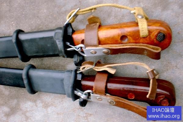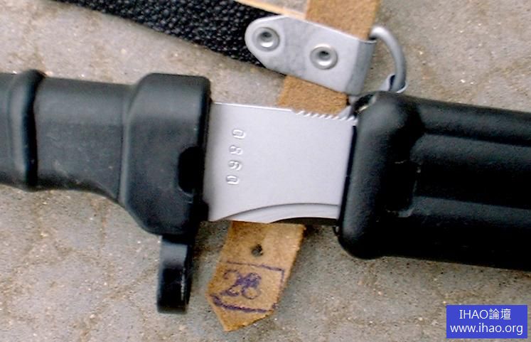 兩種刺刀的刀柄細節。護手上的生產序號一般是用電筆寫的,或者用機器蝕刻,但很少用壓印。序號上的最後4個數字是步槍的序號,也就是說,每一把刺刀都是專門生產配給每一枝步槍的,在大多數情況下,刺刀和刀鞘上都有生產序號。這樣做的目的其實是讓生產工人在檢查過每一把刺刀都與刀鞘相匹配,然後才打上“合格”的記號。有些刺刀上沒有序號的,可能那些並不是為部隊生產的,也可能是做質量檢查時發現與刀鞘並不相配。槍口環的頂端、刀柄的卡筍和刀鞘上也可能會印有生產廠的標記。