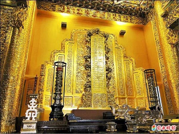 〔自由時報記者黃博郎/台南報導〕台南「南鯤鯓代天府」籌劃約半世紀、動用一萬零八百兩黃金(市價約六億元)才打造成凌霄寶殿的鎮殿之寶─兩丈純金玉旨,歷時三個月,閉門在殿內鑄造,廿四小時滴水不漏戒護,匠師暨人員進出都須受金屬探測器搜身;昨揭示後觀者無不讚嘆,廟方說,這是全球最壯觀的黃金玉旨!