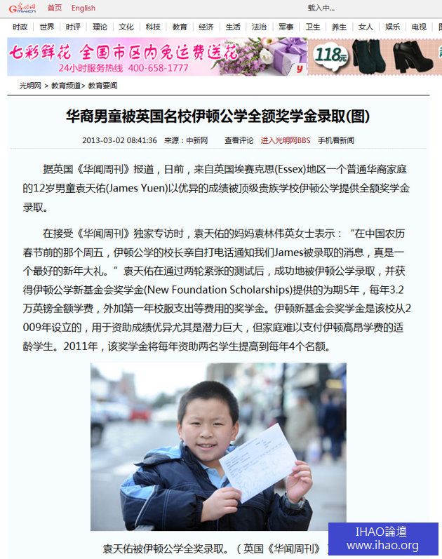 英國一個12歲的華裔男童,被貴族學校伊頓公學以全額獎學金錄取。