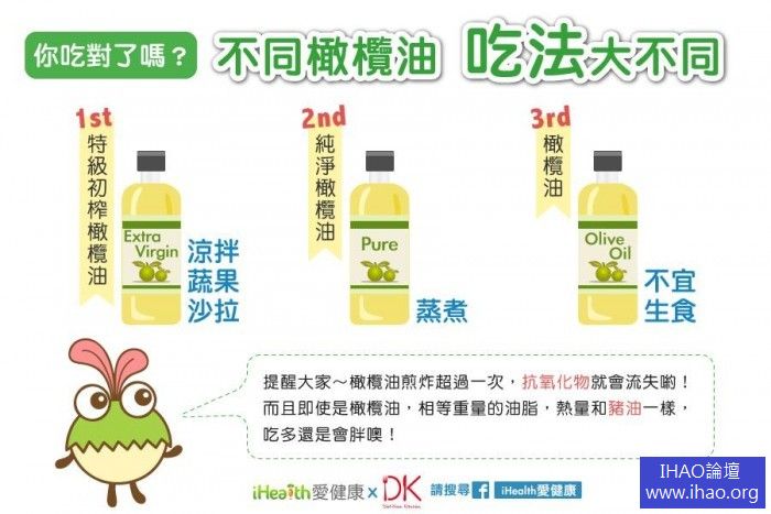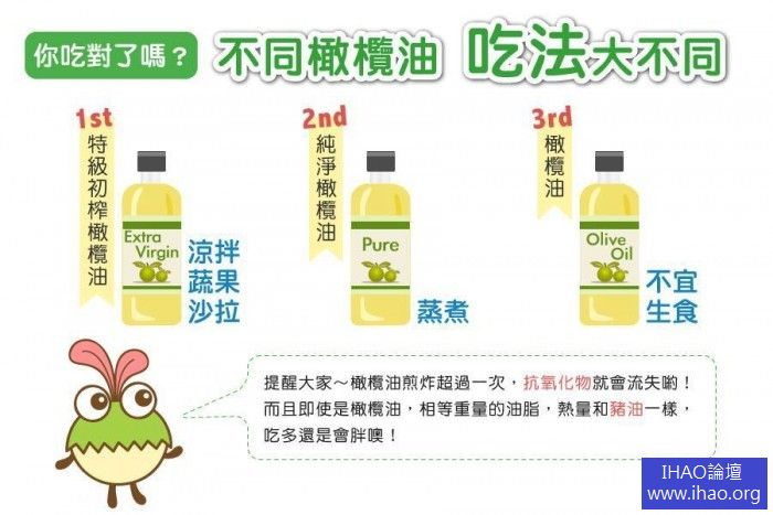 6.不同等級橄欖油有不同冒煙點,宜加考慮用於合適烹調法。例如,初搾冷壓特級純橄欖油(cold- pressed Extra Virgin Olive Oil)宜用於歐美蔬果沙拉(蔬果沙拉);蒸煮可用純橄欖油。