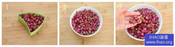 6.取一份玫瑰花蕾放進鍋裡,用小火煮。