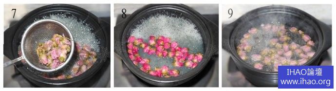 7.一直煮到玫瑰花蕾變色,把花蕾撈出來。