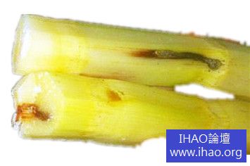 變質的甘蔗裡面呈黑、棕褐色,吃起來有酒精味。這是甘蔗受了串珠鐮刀菌感染並產生了毒素所致。