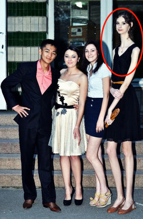 「長頸鹿美女」琉德米拉現年16歲,身高已有197公分。在她10歲的時候,身體開始快速增長,脊椎更因此產生30度的嚴重側彎。在經過按摩、緊身束衣矯正後,琉德米拉的身軀才慢慢拉直,而能像正常人一般生活。