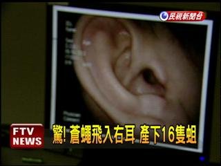 蟲蟲危機,竟然出現在耳朵裡,高雄一名在回收場工作的18歲男子,日前工作休息時,有異物飛入右耳,朋友取出後發現是隻蒼蠅,移除後男子仍覺得很疼痛,就醫經過耳鏡檢查,發現裡頭竟然有16隻蛆,趕緊開刀取出,而蒼蠅竟然在耳道中產卵,在台灣是相當罕見。