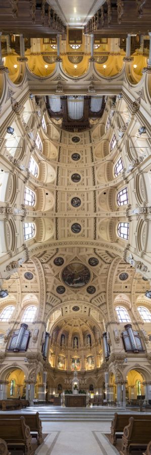 這一系列的教堂照片是由攝影師Richard Silver所拍攝,他巧妙的將平常拍攝大山大水的超廣角全景照轉個角度,將橫幅照片變成直幅,把一座又一座華麗典雅的教堂從大門拍到聖壇,一直是教堂裝飾重點的天花板也一覽無遺的呈現。張力十足的無敵風火輪照讓人有天旋地轉的暈眩感,顛覆視覺空間的概念更勝龜看照,如果看一張還不夠暈,等會的照片連發請先把暈車藥準備好!建議可以不間斷的瀏覽過一次,往上拉回來重新仔細欣賞細節的部份,準備好了嗎?GO!