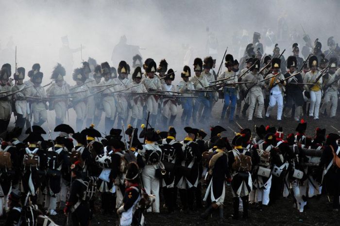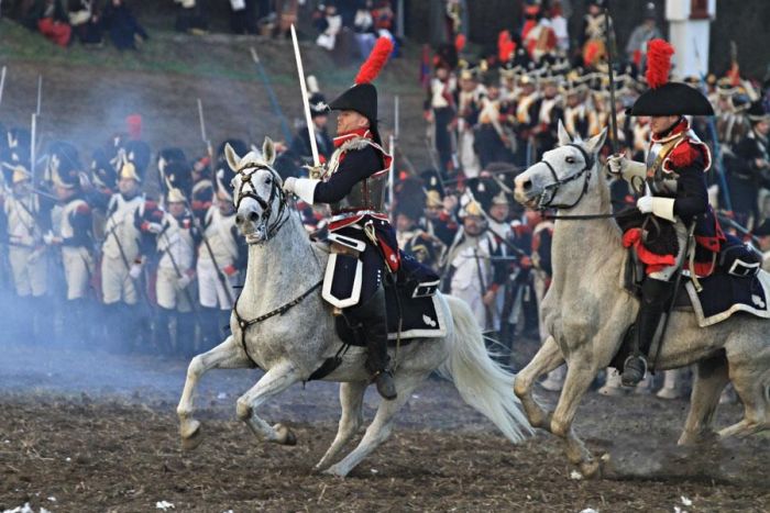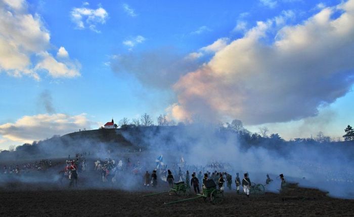 這場戰役因歐洲三個大國的皇帝奧皇弗朗茨二世、沙皇亞歷山大一世、法蘭西第一帝國皇帝拿破崙全部親臨戰場,又稱「三皇會戰」。