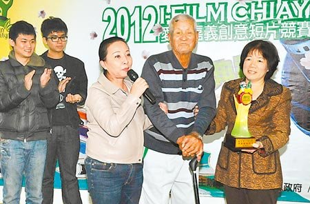 好棒▲由蕭守峰執導,刻畫祖孫情誼的「初一十五」拿下嘉義創意短片賽最佳影片,劇中主角阿公蕭宗(右2)代替孫子到場領獎。(呂妍庭攝)