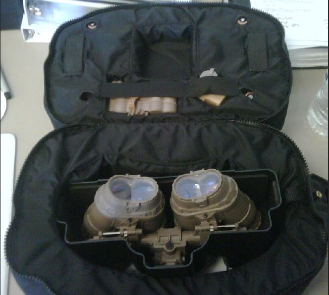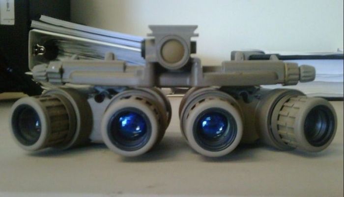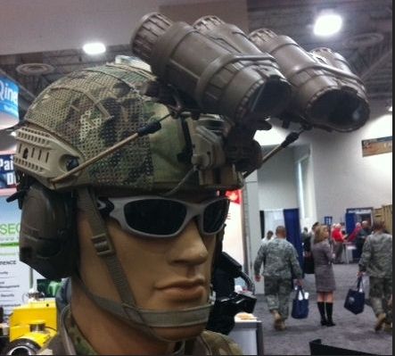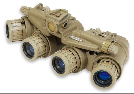 GPNVG-18全稱為地面全景夜視系統,對比傳統夜視儀視角為45度,而這款可以達到120度。幾乎沒有什麼死角,以前曾經給A-10飛行員、空中火控人員配發過,價格達到了令人乍舌的6萬多美元。可以說是為了空中部隊夜間低空對地打擊所用。圖為裝在飛行頭盔上的GPNVG18