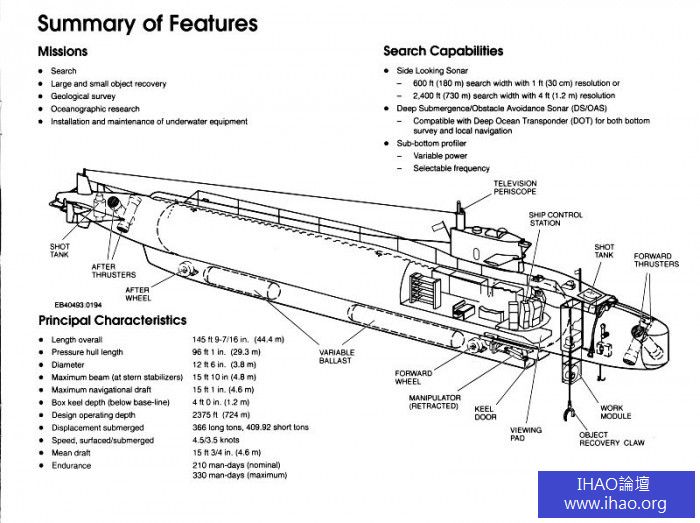 該艇長145英呎(約44米),寬12英呎(約3.6)米,水下排水量393噸,成員7人(2軍官+3士兵+2科研人員),下潛深度可達700多米。潛艇表面有著堅固的外殼,而且還有4個輪子,可以在海床上行走。該艇曾參加過1986年「挑戰者」號太空梭爆炸後殘骸的搜索工作以及1995年對沉船「不列顛尼亞」號的殘骸研究工作。