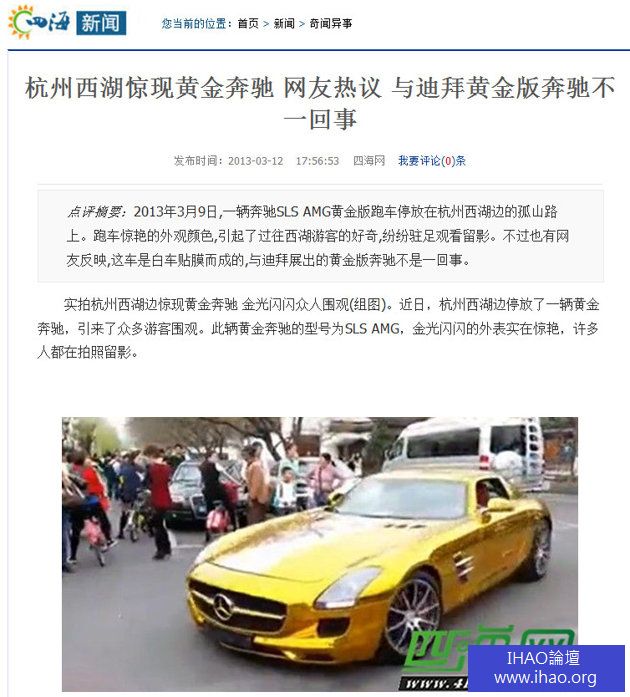 人來人往,遊客眾多的杭州西湖邊突然出現這麼1輛黃金跑車。圍觀民眾:「哇!」