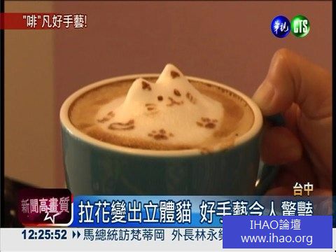 誰說咖啡拉花一定是平面的,台中一間貓咪咖啡廳,老闆突發奇想,用了兩個星期時間,不斷練習,不但把咖啡上面的奶泡變成立體的,還特別用了貓咪造型,看起來就像是一隻貓咪泡在咖啡裡,客人看到這杯咖啡,都覺得太可愛了,捨不得喝。
