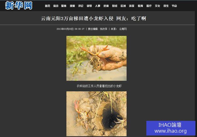 被大陸當局列為2012至2013年正式申遺候選名單的雲南紅河州元陽縣梯田,正進行一場人蝦大戰!在外打工的村民早年引入小龍蝦,放在梯田養殖,沒想到小龍蝦快速繁殖,挖洞穴居,導致3萬多畝梯田千瘡百孔,田埂也被挖空塌陷。為此,當地政府去年起,每年出資110萬元人民幣(約527萬元台幣)清剿小龍蝦。