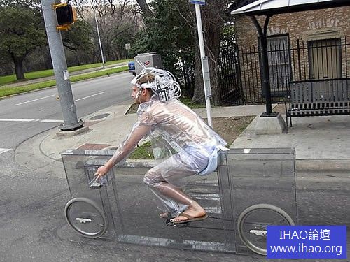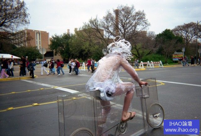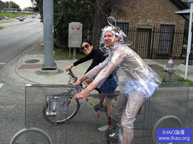 另外,為了和透明的腳踏車來搭配,Jimmy Kuehnle 還身穿一身透明的衣服、褲子 (還好內褲不是透明的) 來當作車衣。但詭異的地方是他還另外自製了一頂 (應該說是一坨) 又大又詭異的安全帽,讓他整個看來就是超級顯眼,但這樣不就和隱形的本意完全背道而馳了嗎?