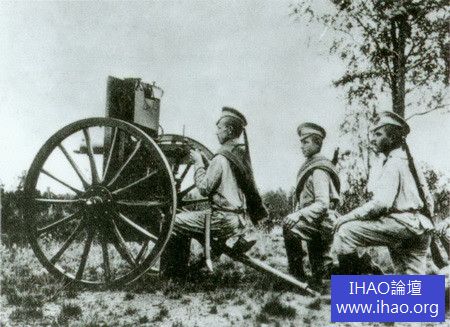 日俄戰爭中俄軍使用的帶有鋼板防盾輪式槍架的馬克沁重機槍。