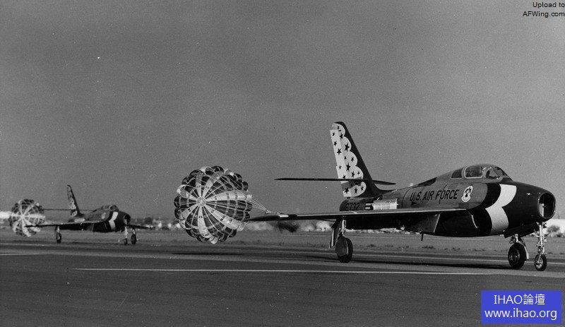 F-84F也是雷鳥第一種安裝了拉煙系統的飛機,甚至還有紅白藍三色減速傘