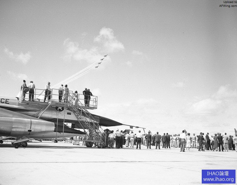 1958年9月康維爾員工在卡斯維爾空軍基地觀看雷鳥飛行表演,下方有一架B-58超音速轟炸機