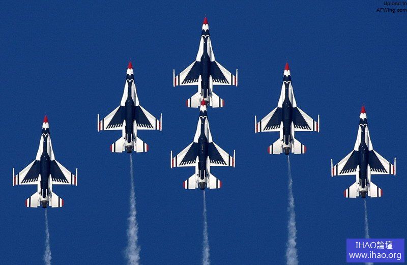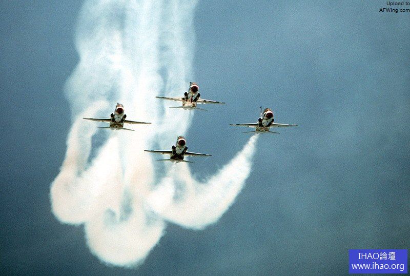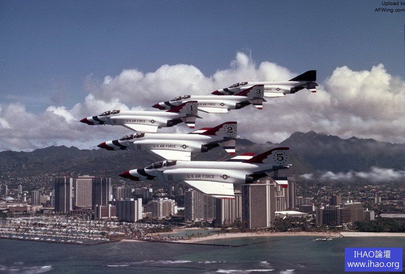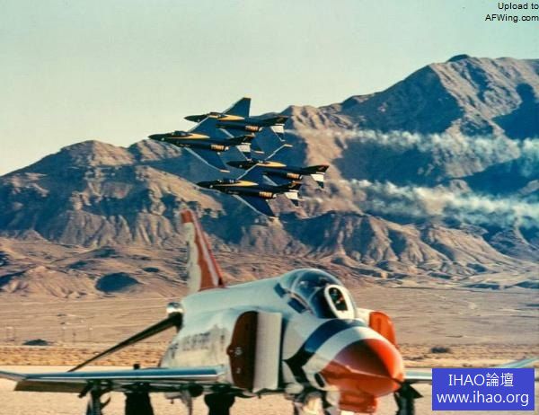 兩軍表演隊的F-4經常同台較勁. 上面為飛行中的美國海軍藍天使特技飛行隊