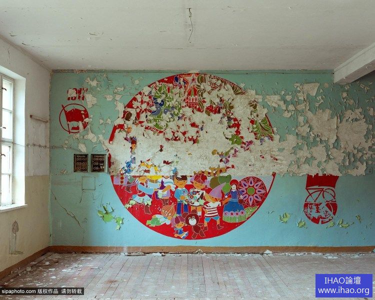 2008年,德國Vogelsang,蘇聯解體後廢棄的軍事基地學校裡的壁畫。該壁畫展現了典型的俄羅斯標誌。左邊是1917年布爾什維克革命的紅色旗幟,右邊是其他一些蘇聯標誌。壁畫很可能是1987創作用來慶祝革命70週年。