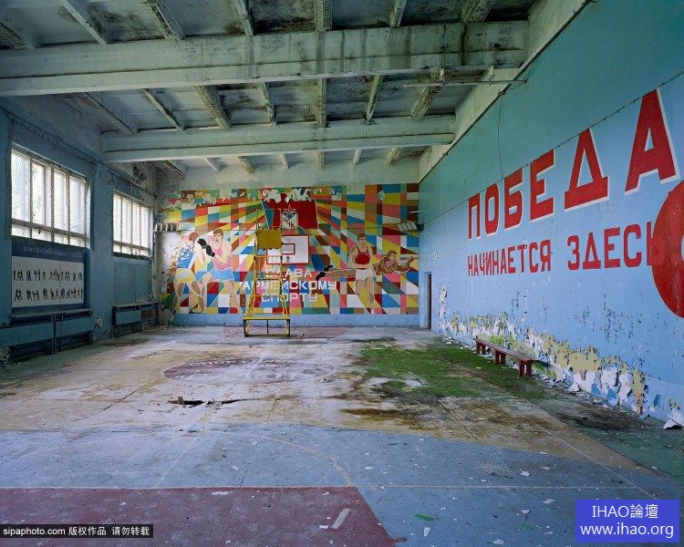 2007年,拉脫維亞,蘇聯解體後廢棄的軍事基地體育館,右邊牆壁寫著“勝利從這裡開始”,而在後面的牆壁寫著“榮耀歸於軍事體育運動”