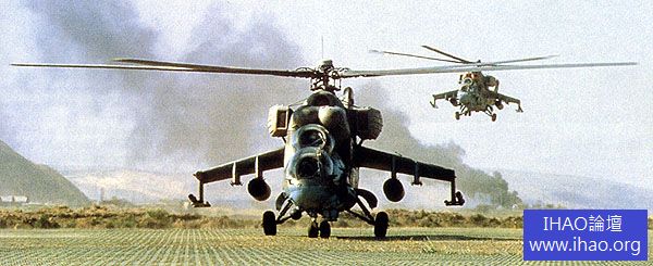 米-24 大概是世界上戰鬥經驗最豐富的作戰飛機了,在20 多年裡就經歷了30 多場戰爭,從非洲的安哥拉,到南美的尼加拉瓜;從歐洲的波士尼亞,到中亞的車臣;歷史上很少作戰飛機有比米-24 更豐富的戰鬥經歷。米-24 的首戰是在1978 年的衣索比亞,當時索馬利亞軍閥巴爾將軍進攻衣索比亞的厄立特里亞省,衣索比亞的米-24 在蘇聯顧問指揮下,由古巴飛行員操縱,發動反擊,取得很不錯的戰果。但米-24 最輝煌的戰績,無疑是在阿富汗。