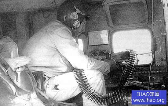 這架Mi-24乘員艙內安排了機槍手操縱PKT 7.62-mm機槍