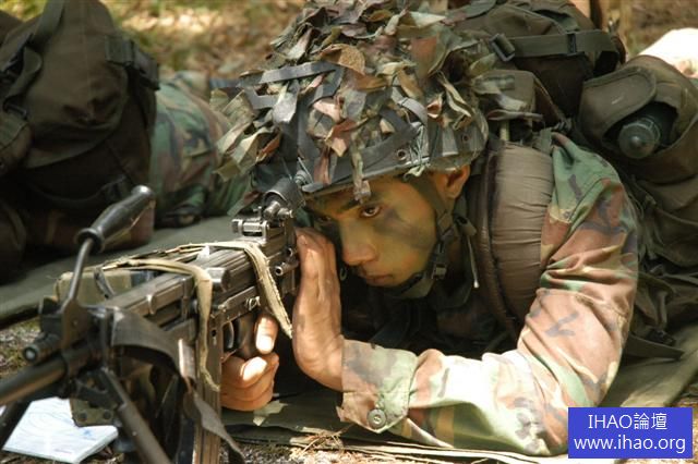 裝備Ulti max 100 式MK3 型輕機槍的新加坡陸軍,圖中左邊的士兵使用的是M16S1 ,是由CIS 公司生產的M16A1