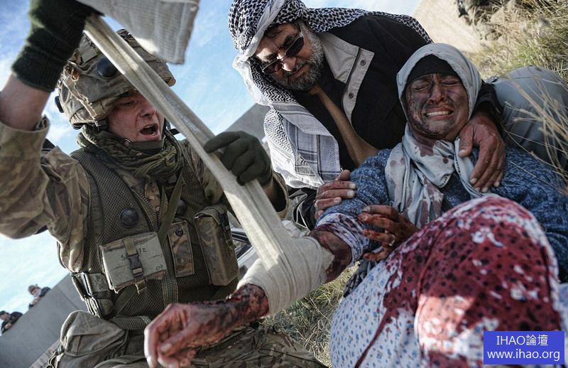 莫里森所拍攝的作品集中包括這張士兵訓練包紮受傷婦女的傷口的照片