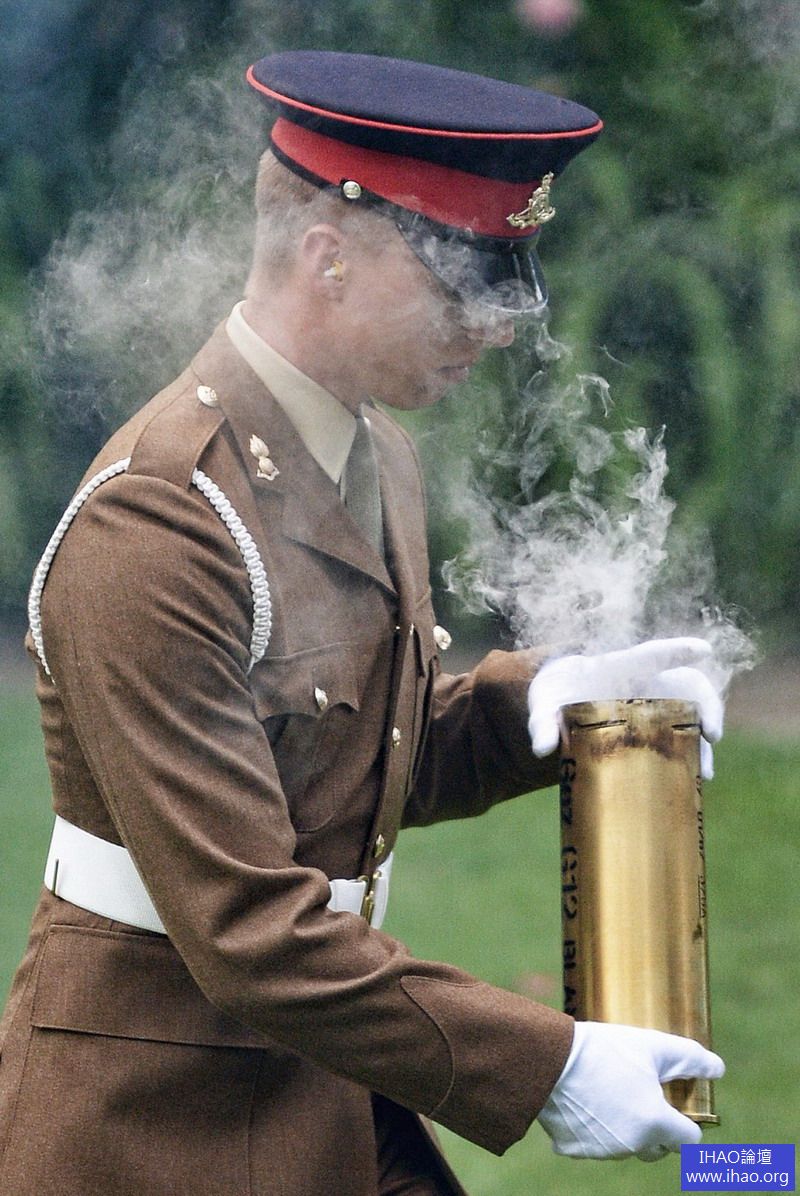 莫里森拍攝的照片,一名英國士兵剛剛發射完為慶祝愛丁堡公爵93歲生日而準備的禮炮