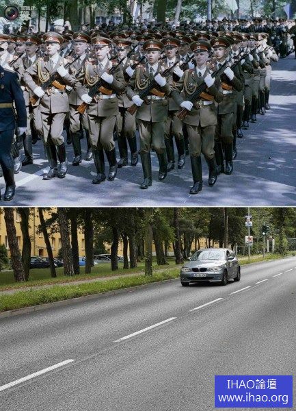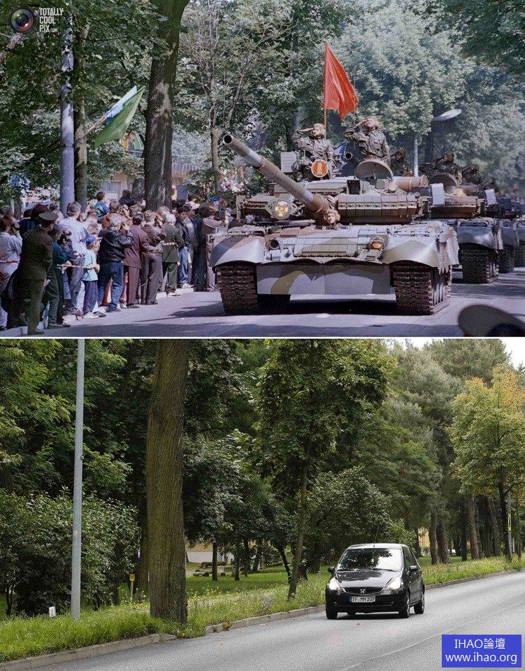 東德溫斯道夫的獨聯體軍隊總部,參加告別閱兵的蘇聯坦克(上圖)。下圖為當前的溫斯道夫的同一地點。