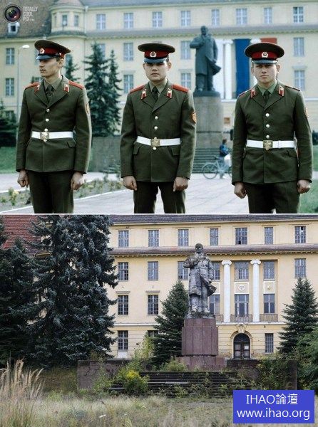 東德溫斯道夫的蘇聯體軍隊總部,參加告別閱兵的蘇聯士兵(上圖)。下圖為當前的溫斯道夫的同一地點拍攝。