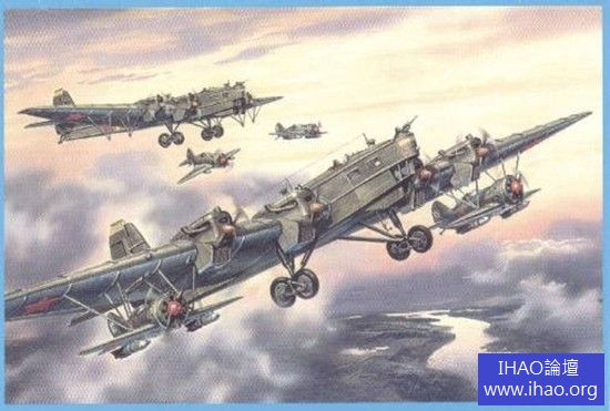 經過改裝的TB-3轟炸機,每個機翼下面各懸掛一架I-16戰鬥機,掛載250公斤炸彈