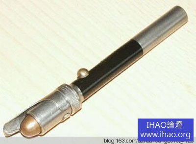 美國生產的一種筆式無管槍,槍彈直接卡在筆身的一端,擊發後靠彈殼導引保持一定的射擊方向