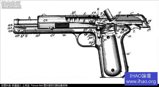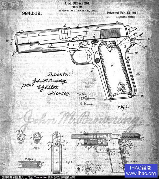 白朗寧用230格令(15公克)全被甲彈頭把0.38英寸轉輪手槍彈改成了0.45英寸口徑的無突緣式手槍彈,並把這種口徑的手槍交給美國陸軍進行評估。選型試驗在1906年開始進行,多家公司參與競爭。最後柯爾特公司和薩維奇公司的樣槍被選中。軍械部要求廠方繼續改進功能和可靠性參加進一步的試驗。