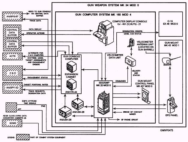 MK45 型127毫米艦炮是Mk34 艦炮武器系統的一部分,該武器系統是神盾(AEGIS)戰鬥系統的子系統,可與海上火力控制系統相連。除MK45 型艦炮之外,Mk34 艦炮武器系統還包括Mk160火炮計算機系統和Mk46式光學瞄具。