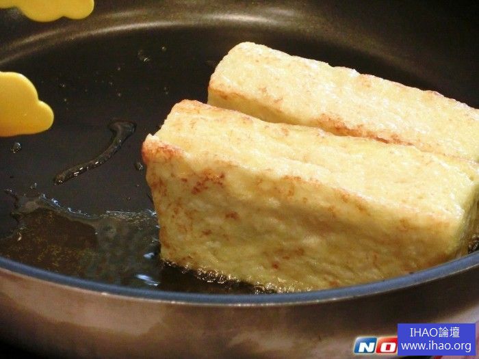 ▲將飽滿吸收24小時蛋液的吐司,放入鍋中油煎至金黃色澤,接著再放入烤箱更顯出吐司蓬鬆感。