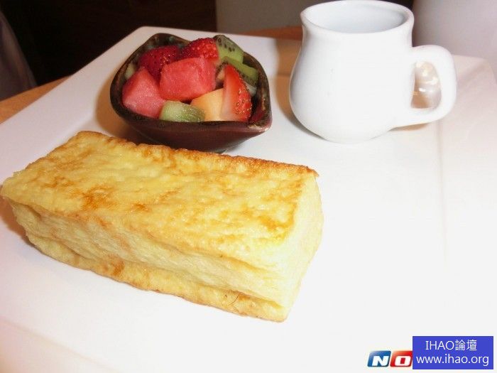 一口咬下,宛如品嚐一道滑嫩的牛奶吐司,舌尖一壓,散發出濃厚的牛奶香味;而經過煎烤的蛋汁外皮,更顯誘人可口,並可搭配一旁的綜合水果丁,不僅帶有繽紛色彩的視覺效果,也能讓口中滋味達到平衡感。