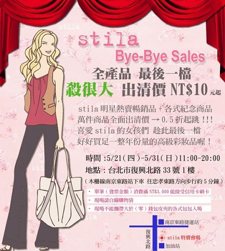 天下沒有不散的筵席。代理stila的莉迪亞國際事業有限公司決定為stila的暫別做一個完美的告別式特賣會。地點是