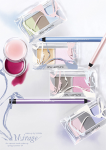 shu uemura國際彩妝總監打出角康創造2009年的春夏彩妝時,完全以女性面部輪廓為主題,跳脫傳統面部彩妝構圖的概念,以看似不經琢磨的手法,將映入眼底的各式對比色彩,調和出和諧的色彩表現,變化成這一季春夏彩妝裡迷離夢幻的海市蜃樓(Mirage)。