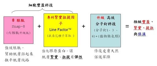 時空彈力8胜肽緊容霜/乳擁有最新的抗老技術「細胞豐盈科技」,從扭轉DNA開始,讓細胞豐盈飽滿,再注入8胜肽讓肌膚表面能立即拉提,伊麗莎白雅頓台灣分公司教育訓練經理曾雪玲表示: 「8胜肽緊容霜/乳擁有最新的抗老技術"細胞豐盈科技Cellular Plumping Technology (CPT)",利用8胜肽與由專利緊實提拉因子Line FactorTM (由扶桑花種子所萃取研發的天然抗老成份),讓肌膚立即豐盈拉提起來,醫學研究證實連續使用 30 天後,紋路深度減少35%,同時8胜肽緊容霜,也擁有SPF30紫外線防護功能,可徹底對抗紫外線的傷害。」