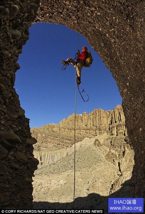 登山者正觀察在Chuksang附近發現的洞穴。沒有人知道建造者是怎樣爬上這155英尺的崖壁。