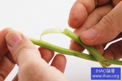 地瓜葉料理前,需先撕下莖梗部的厚皮纖維。
